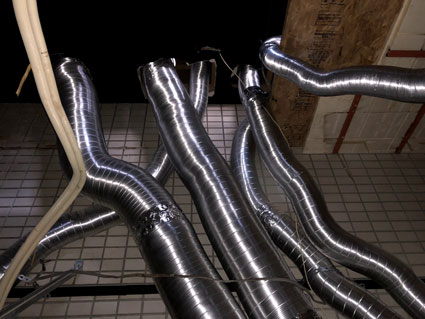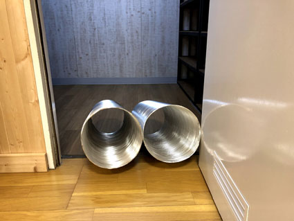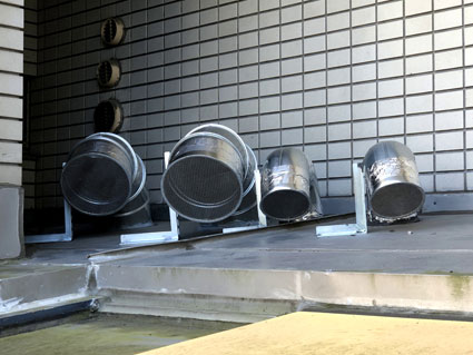 〇大量の排気にともなう吸気を増やすために、大型の給気口を建物裏からスタジオ内に通しました。
