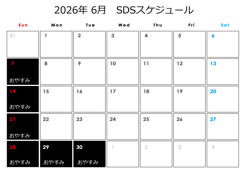 スパイラルダンススタジオ 2026 SDSスタジオスケジュール 4月のスケジュール ![]() 5月のスケジュール ![]() ※5月は1日、2日がお休みとなり、29日と30日がレッスン日となります。 6月のスケジュール ![]() ※祝日はお休みです! ※レッスンは月4回(スタジオの都合により減る場合があります)となり、5週目はお休みとなります。 営業時間 月曜 18:00~22:00 火曜 17:00~22:00 水曜 18:00~20:30 木曜 17:00~21:30 金曜 17:30~22:00 土曜 12:00~22:00 |